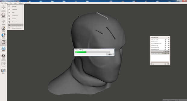MeshMixer es gran herramienta para mover las cuchillas en la posición correcta y para cortar la malla. Utilice "Edición" y "Transformar" para colocar los cuchillos. Puede ocultar la cabeza haciendo clic en el pequeño ojo examinador de objetos. Asegúrese de que los cuchillos no se superponen.
