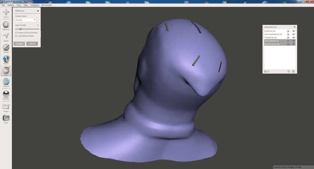 Lamentablemente no se puede quitar los cuchillos a la vez en Meshmixer. Selecciona la cabeza y un cuchillo (manteniendo la tecla shift) y selecciona "Diferencia booleana". Anule la selección de "Preservar las fronteras de grupo" y "Auto-reducir resultado" y haga clic en Aceptar.