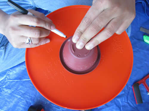 En la parte inferior de la primera canastilla, rastrear su rejilla de desagüe o recipiente de plástico y marcar un círculo en la parte inferior de la canastilla de primera. Asegúrese de que su círculo es más pequeño que el labio del recipiente.