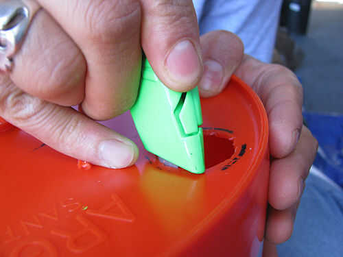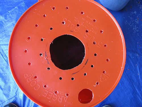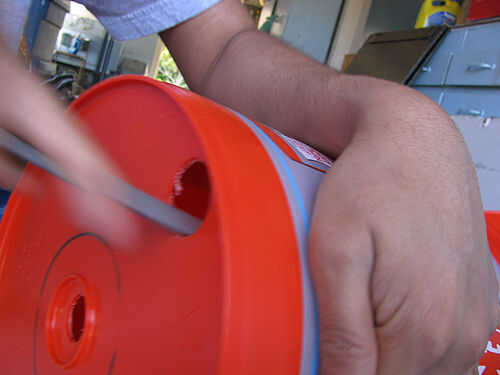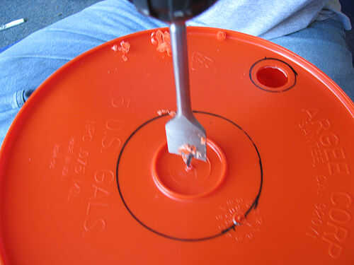 En el primer cubo y la tapa los agujeros grandes, empezar con un taladro, usando una broca de 1" mampostería. Utilice el cuchillo para ensanchar los orificios.