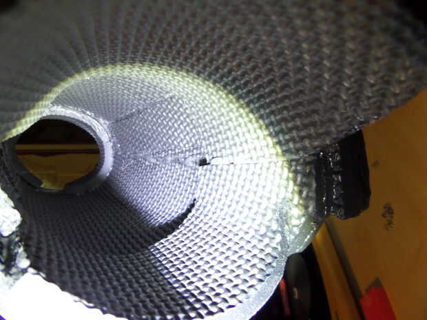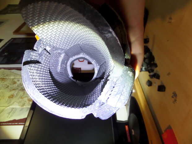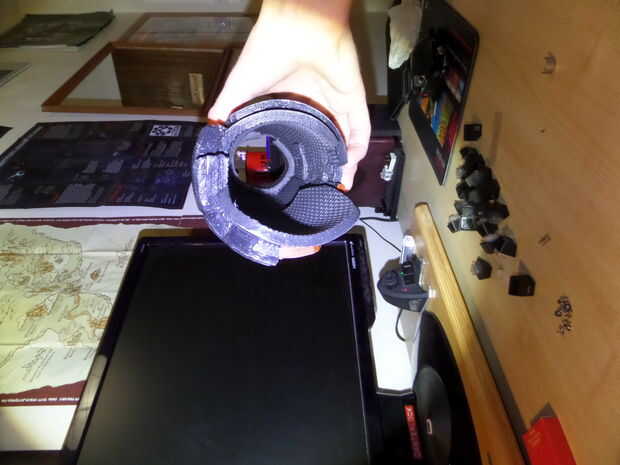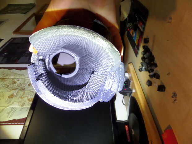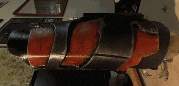 Los antebrazos están compuestos de 2-3 capas superpuestas, con las secciones gris formando las capas más externas y la naranja de mentira debajo de la mitad superior. La naranja la sección hace uso de 2:20 líneas en el interior para lograr curvas más agudas y biselado a cada lado a fusionarse con las capas externas (evita filos dentro).