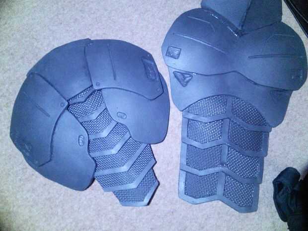 Son de eBay y lugares como Halfords para alrededor de £20 (para un paquete de 12 azulejos de tamaño 60x60cm). Tendrá sobre los azulejos 9-10 para este traje que le arreglan los recortes para reducir residuos: aproximadamente el 75% de la espuma se terminó en el traje real. Dependiendo de donde usted compre, pueden encontrarlos como hojas espesor 8 mm, 12 mm. Estos últimos son más rígidos, pero menos fácilmente con cúpula e inevitablemente serán más pesadas. Recomiendo las hojas de 8mm para la armadura diseñada para ajustarse a su cuerpo.