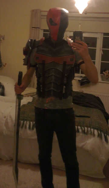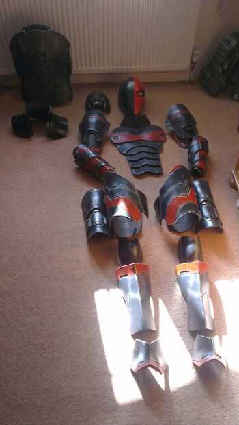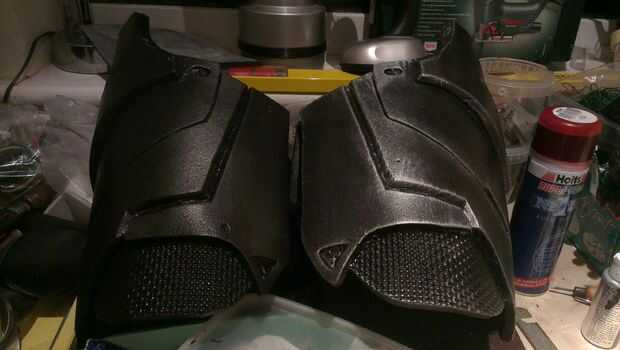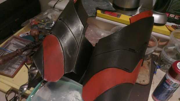 Si tienes tiempo, utilice una mezcla 50/50 de agua y PVA para preparar la espuma con varias capas de pegamento. Lo contrario, ir directamente a la mezcla de pintura, agua y pegamento PVA en partes iguales a mano de pintura la espuma. Si es necesario, diluir la mezcla con más agua hasta que ya no se observan trazos de blush. Puede tomar 3-5 capas hasta que el color de la espuma está suficientemente oculto. Había pintado gris en primer lugar, luego le dio la armadura toda una fina capa de plata oscuro, antes de pintar los detalles naranja en. Utilice un taco un poco húmedo de toalla de cocina para un riego por combinación de pintura de acrílico negra como una"suciedad" en las secciones de naranja.