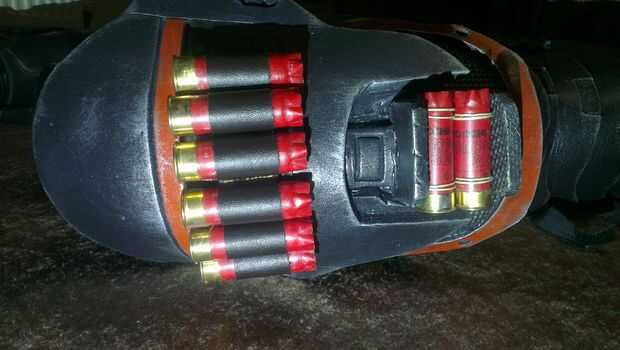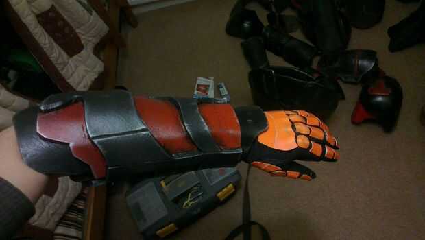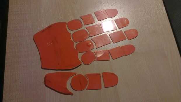 Para los guantes, he trazado alrededor de mis manos y cortar la forma del plástico naranja, eliminación de varios milímetros entre cada sección para facilitar el movimiento. Después de calentar y doblar la chapa, pegadas a los guantes y les dio una capa ligera de pintura en aerosol negro para oscurecer en el mismo color que el resto de la armadura (no se muestra en las fotos). Poner en y llevó varias veces en el transcurso de una reciente comic con y perdió 5 de las placas. Yo recomendaría encontrar un par de guantes "duro knuckled" y pintura los nudillos con la mano en su lugar: Esto reduce la carga de trabajo y más durable que rasguño haría guantes.
