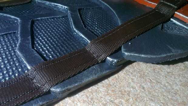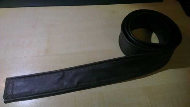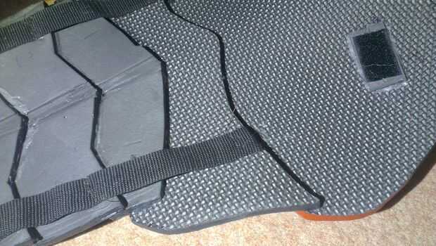Encontré que las correas acolchadas parecía muy similar al cuero y las correas, que usé en lugar de estándar de las correas o cosiendo tiras de cuero. Yo les viró en su lugar con pegamento caliente, pero nada que no sea directo de espuma a espuma no adherirse bien, por lo que requirieron puntadas en lugar. En el lado opuesto, dos tiras de cinta delgada actuaron como guías para el elástico de las correas ligan el torso. Siempre que fue necesario colocar Velcro o elástico de la espuma, sería en cambio coser a una tira de espuma que había cortado lateralmente y pegue a la pieza de espuma real. Esto les impide pelar, pero evita las puntadas que muestra a través del otro lado.