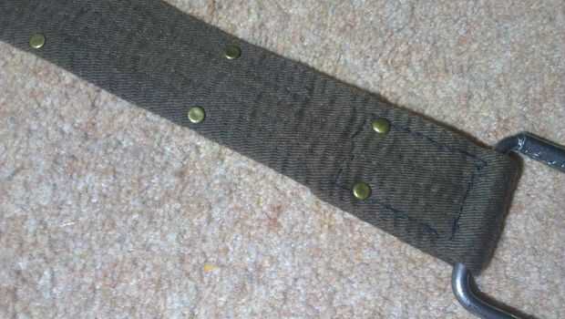 Inicialmente hice un lazo hombro desde cero con cuero del faux de la tela y la línea de ropa para evitar que, pero era demasiado fina en el medio, así que compró un cinturón de karate largo para aproximadamente £3 y poner remaches en él haciendo un agujero con un destornillador pequeño, meter el remache a través, corte la longitud excesiva de remache con un par de pinzas , para que sea redonda, apretando luego tapado se fuera con la otra mitad del remache. Me formó un anillo cuadrado desde la izquierda por barras de metal y cosió al otro extremo para que el otro extremo de la correa podría colocar a través de y en sí mismo. Sólo usé suficientes remaches para cubrir mi frente y la espalda, que ascienden a cerca de 50 (con separación de 6cm a lo largo de la correa).