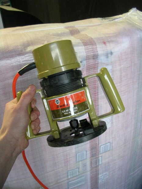 tomé prestado un router, que es una herramienta como un taladro pero en lugar de bits que deben ir las cosas verticalmente, esto es girar y presionar horizontalmente contra las cosas y los lados de la broca se utilizan para crear labios y tal para Antepechos o qué has.