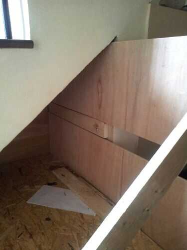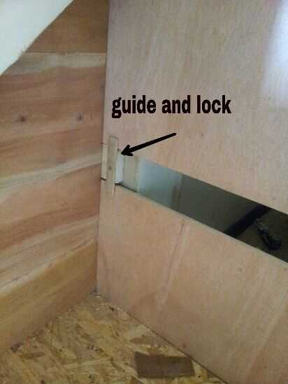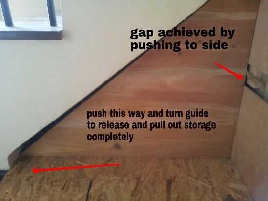 Cuando sacó mi trastero que encontré el área de suelo debajo de la escalera no era nivel demasiado. El listón de guía de almacenamiento de información fue roce y conseguir pegado en ciertas zonas en el panel lateral superior. Así que quitar el panel lateral superior y lijar para que no se atascan mientras tira.