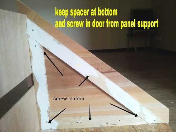 Ahora el panel de la puerta, placea separador en la parte inferior y fije la puerta al apoyo delantero de ángulo recto. Asegúrese de fijar todos los listones de 3 del soporte de ángulo hacia la puerta. Ahora el soporte de ángulo y la puerta se convertiría en una pieza. Cuando desmontar para pintar, solo Desenrosque de paneles laterales y los paneles inferiores.