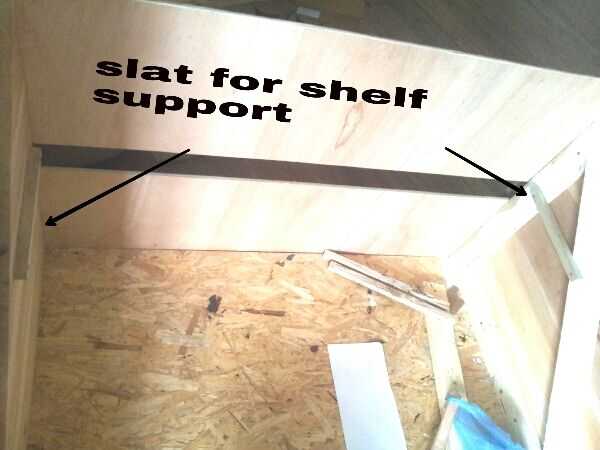 Como había suficiente espacio he querido añadir un estante. Así que me fijo 2 listones como soporte del estante en los paneles frontales y posterior en la altura igual. Medir largo y ancho y cortado estante a la medida.