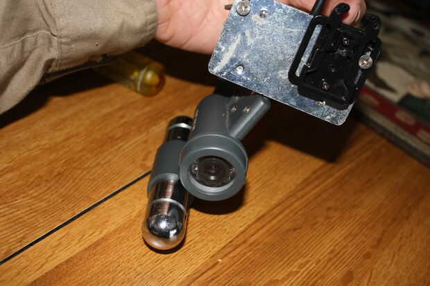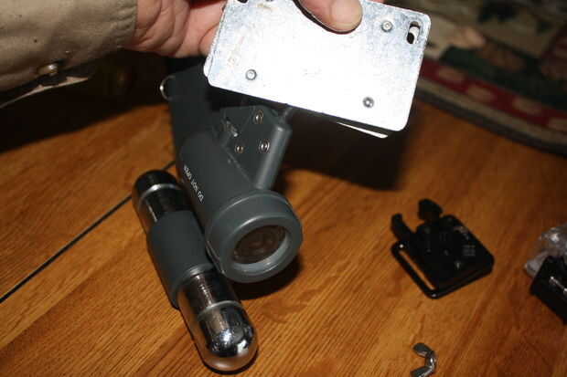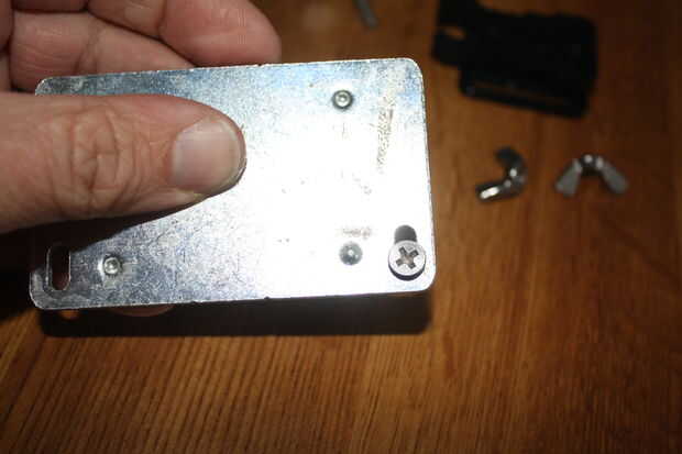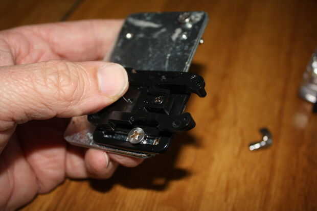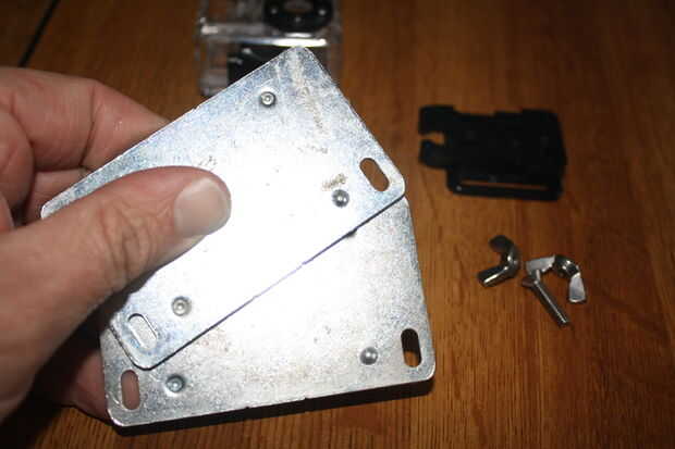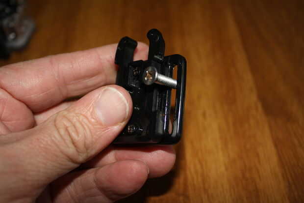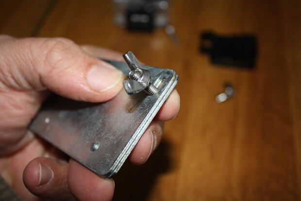 Sandwich juntos su peso y empuje la perilla y a través del orificio del perno y apriete. Ahora romper el cordón entre las dos placas y empuje el perno a través del otro agujero y tu montura de la cámara. Asegúrese de que está todo frente y apretar hasta que quede firme.
