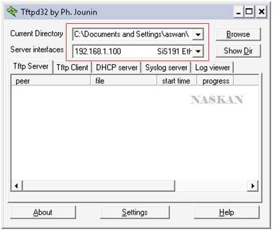 Ejecutar TFTP e interfaz de servidor de configuración de ip 192.168.1.100