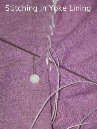 Finalmente doble sobre el margen de costura en los costados expuestos del yugo de la frente y mano coserlo a las costuras correspondientes como hiciste con el puño de la manga.