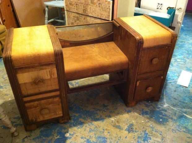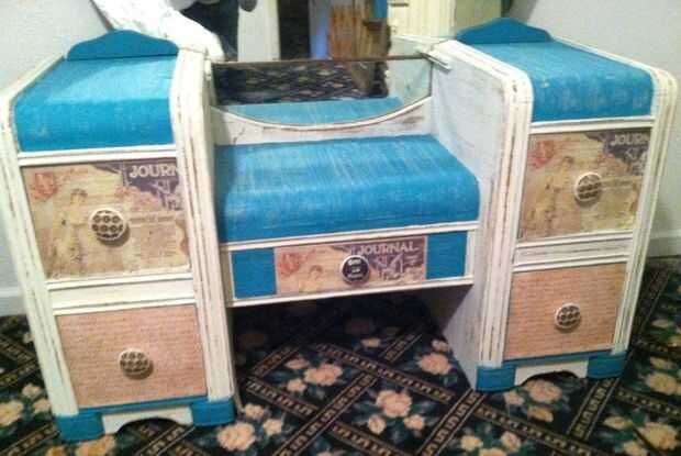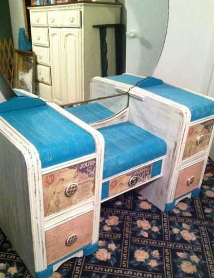 Hola, compartir mi pintura/hacer sobre mi vanidad de cascada era 1940. Compré esta vanidad de otro compañero "seleccionador" tuvo algunos problemas importantes y daños por agua pelar chapa-la primera imagen son luego de pelado y fija algunos chapa en él. La estructura también fue tambaleante, clavado y fijo a cada condición de uso de día. El espejo es original, así que estaba muy feliz de llegar a esto, como he visto a muchos con ningún espejo o dañados espejos.