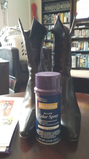 Como se puede ver en el antes de fotos eran negros y tenían la forma básica de las originales botas con un tacón ligeramente más alto (3 pulgadas, en lugar de los talones del gatito de 2 pulgadas del original). Después de haber aprendido de crear el traje de Starlord que existe de hecho una pintura que se puede utilizar en cuero que no pele, (Meltonian vida Nu Color pintura de aerosol) fui a Amazon y consiguió un bote de pintura morado por $6.00.