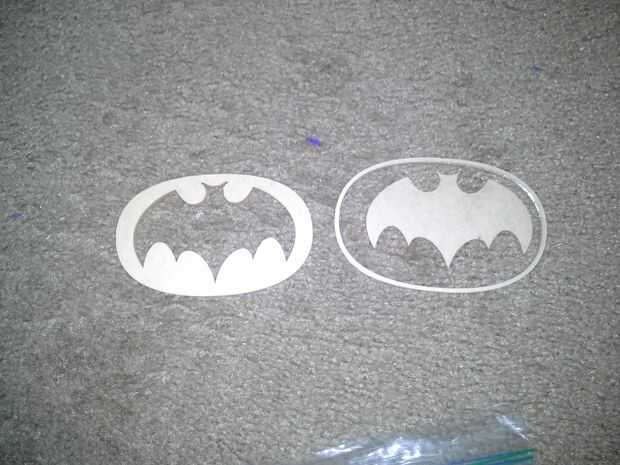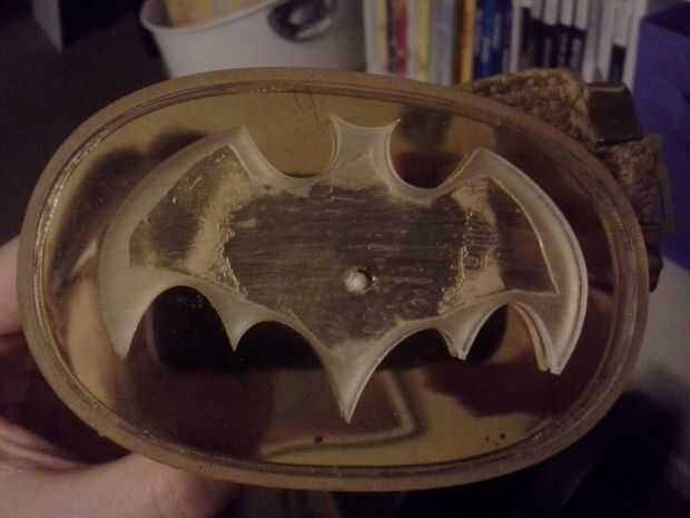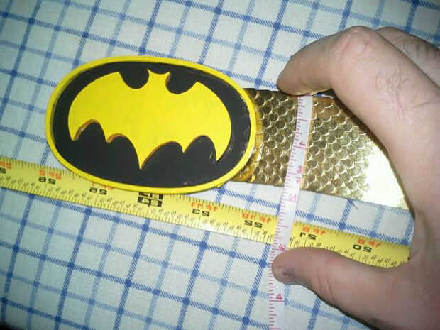 Después de las botas me trasladé a la correa. Mi pareja en lucha contra el crimen (diseñador gráfico, Dave) a crear los símbolos de pecho para nuestros trajes y el cinturón de hebilla símbolo para mi rad cinturón vintage. Tenía el símbolo de corte de plástico duro (esto fue super cool con el cortador del laser teniendo todo unos 2 minutos para hacerlo) y utilizamos pegamento super fuerte para pegarlos en el lugar, después de que fue un asunto de la pintura hacia fuera y luego hacer las bolsas de cinturón en casa el tiburón repelente.