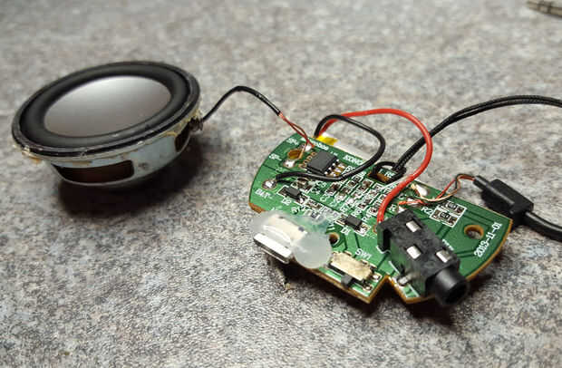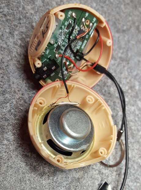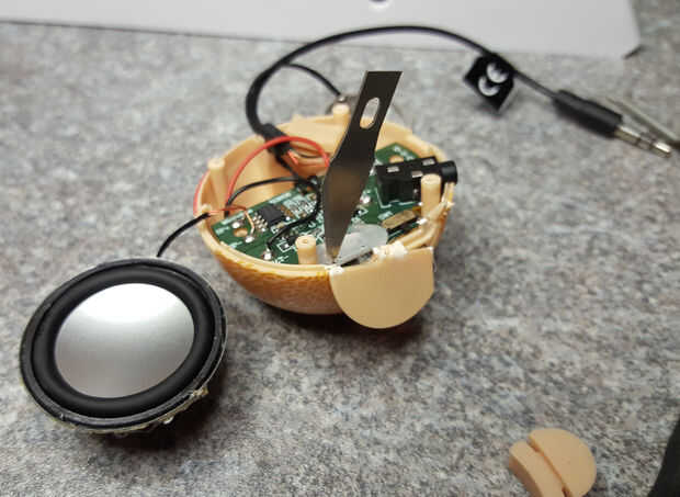 El altavoz era bien pegado a la rejilla, por lo que marqué con cuidado alrededor del borde exterior con un cuchillo pequeño destornillador y arte para quitar el pegamento, estrecho evitando meter un agujero en el cono del altavoz. El circuito fue un poco más complicado, se celebró en un tornillo y cola caliente, que quité un poquito a la vez con un bisturí bajo una lámpara de aumento.