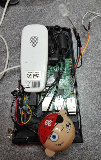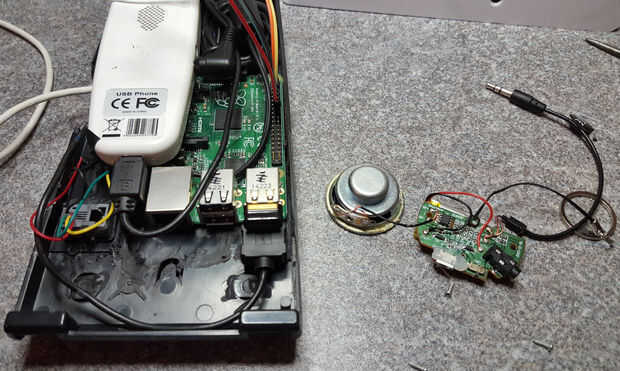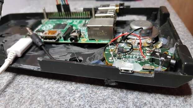 Finalmente el circuito delicado, batería y altavoz fueron libres de la caja y listo para agregar al teléfono (después de las pruebas para asegurarse de que todavía trabajaban). Inicialmente había planeado tener el altavoz "always on" constantemente conectado a la Pi para cargar, y comenzó a preocuparse de cómo esto puede interferir con la energía de Pi y si carga constante haría que la batería minúsculo ir pop. Me decidí a montar la placa en la caja del teléfono, cortando una ranura para hacer el puerto de carga e interruptor accesible sin desmontar el teléfono. Me perforó un agujero de 25mm en la base de la caja del altavoz y luego caliente encolar la Junta en su lugar.