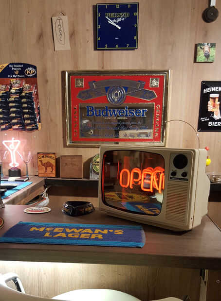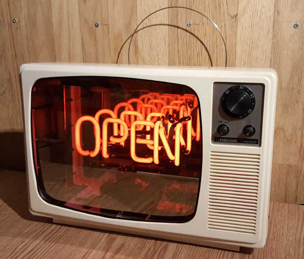 Se trata de una televisión de Ferguson Courier principios del decenio de 1970 que he convertido en un espejo infinito, con un neón modernos «Abierto» signo interior que brilla intensamente. La función de encendido / apagada / Flash se controla haciendo girar la TV tuning dial - que es lo que utiliza para cambiar los canales con en los niños de la antigüedad!