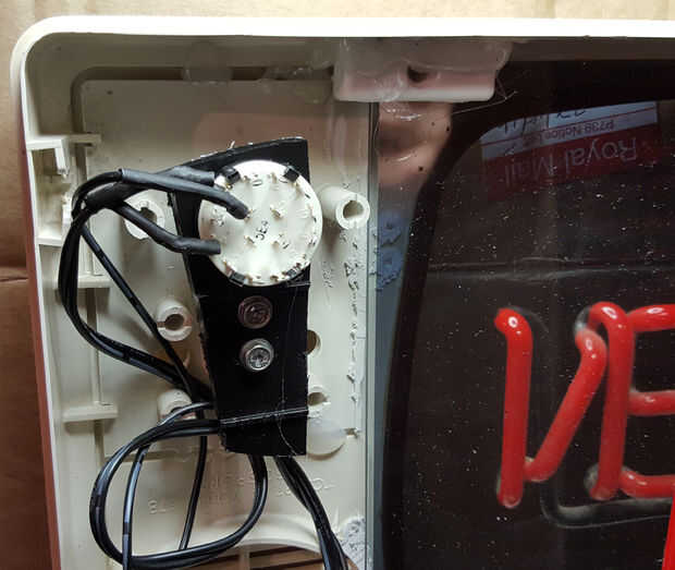 El interruptor giratorio apretó muy bien en su soporte hecho en casa y luego caliente-pegué la toma de corriente dentro de la caja, el cable de alimentación a través de un agujero conveniente.