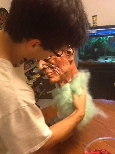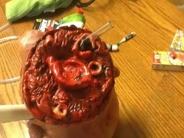 ¿Hambre? Asustar a los forrajeadores enlazado a nevera comida muerto de hambre con un la cabeza en un frasco de!Utilizando un editor de fotos, dos imágenes se mezclan juntos para crear la imagen plana de una cabeza, que es entonces laminado y sumergi