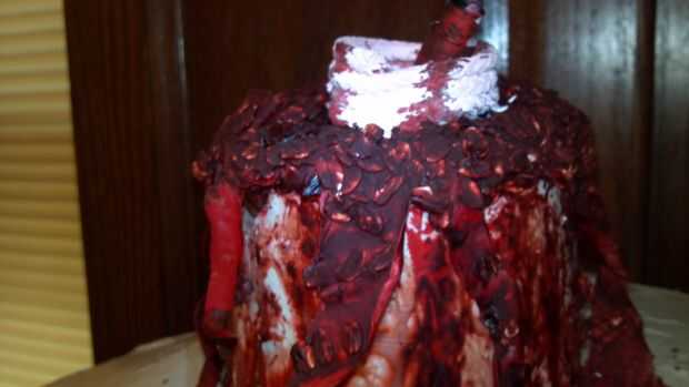 Entonces tomé globos y rasgó para arriba, sumergido en sangre falsa y pegado a la parte superior del cuello cortado. Entonces hice una mezcla de pegamento blanco, avena y sangre falsa. Colocar la mezcla en la parte superior del cuello cercenado, da una gran descomposición carne picada. Entonces tomé un cordón de zapato y pegamento alrededor del cuello de un hueso del cuello.