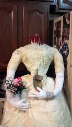 Luego hice rajas en vestido por lo que pude poner mis manos a través de por lo que pude tomar. Viró las ranuras para que las costuras no se desintegraría en el vestido. También puso en pie con vestido y marcada y corte un orificio de mi cabeza se deslice a través. También ha añadido bateo guantes de ópera mucho y fijarse para vestir los brazos con rosca.