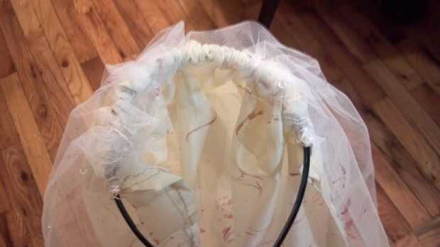 Entonces tomé cortinas viejas y une con pegamento blanco, se puede coser o utilice pegamento caliente para unir a una banda de la cabeza. Hacer un corte hasta la mitad del velo.