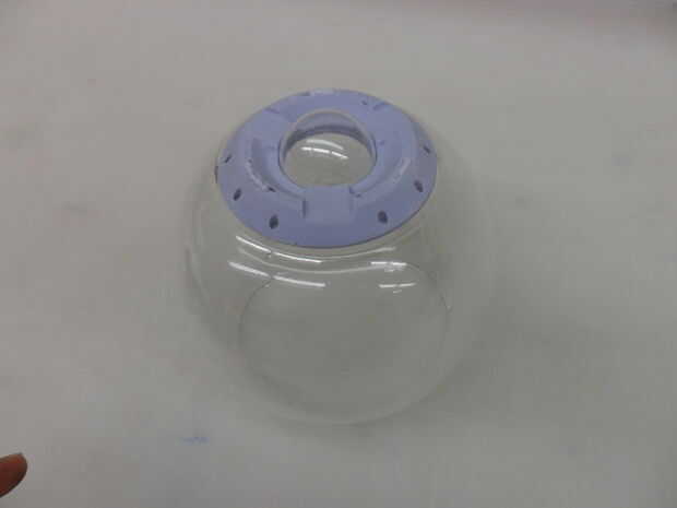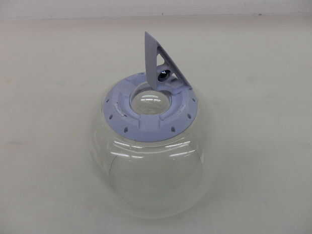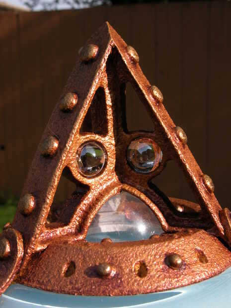 Los juguetes de gato bola claro vinieron appart y coloca la mitad en el centro de la tapa, entonces utiliza pegamento Gorilla para pegar las piezas del cono de nariz en el juguete de gato claro y la tapa del cono de nariz. Una vez secos luego pega la pieza de assemled todo el recipiente de vidrio. Luego apliqué los ojos saltones para remaches.