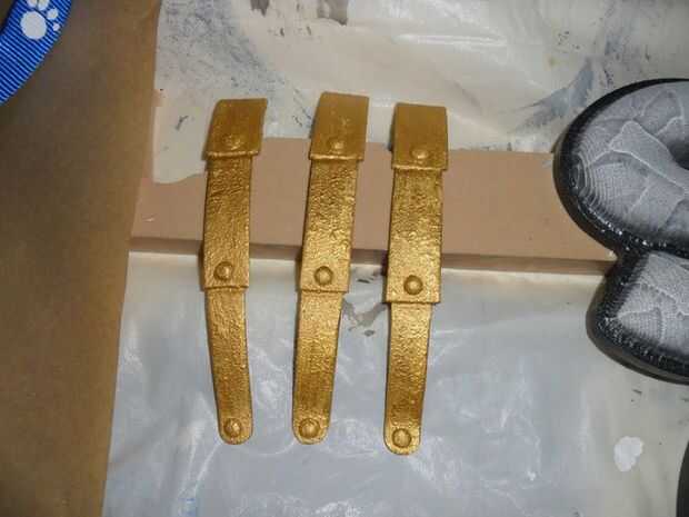 Luego gorila pegada en el riverts, todo preparado y aplicado la primera capa de pintura metálica de oro. Luego usé una combinación de pegamento pistola de pegamento caliente y pegamento Gorilla para aplicarlos a la taza.