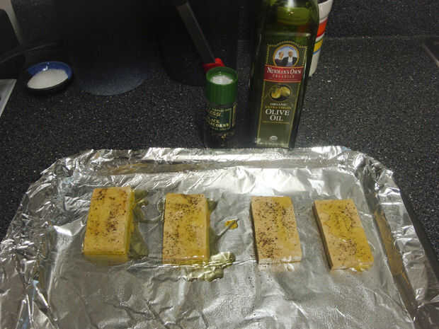 Rociar aproximadamente media cucharada de aceite de oliva encima de cada rebanada de tofu. Realmente no necesitas mucho...