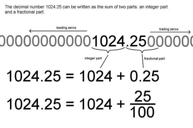 La parte entera consiste en cada dígito a la izquierda del punto decimal. La parte fraccionaria consiste en el punto decimal y cada dígito a la derecha del punto decimal.