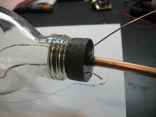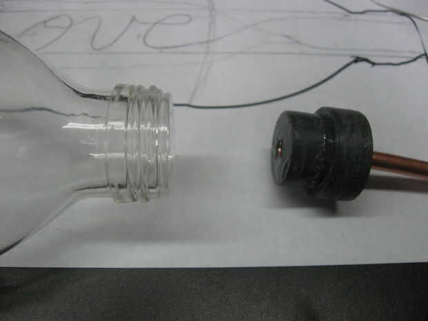 Alinee cuidadosamente los cables dentro de la botella para máxima visibilidad. Con la resina de la 2 parte, pegue los electrodos y el tubo de cobre en el lugar pero no pegar el tapón en su lugar. Permiten el montaje curar.