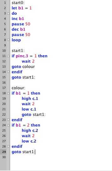 Aquí el único desafío fue un para tomar la decisión al azar. Im todavía nuevo en Picaxe, por lo que sólo tienes que configurar una variable igual a 1 entonces rápidamente agrega y resta 1 de en entonces en el momento que se presiona el botón toma la variable y si es un 1 luego una luz se enciende y si es un 2 entonces el otro se hace. fue al azar para mi gusto y parece que funciona bien.