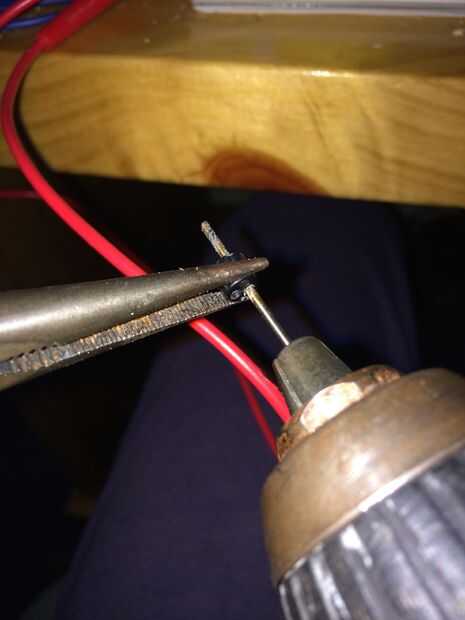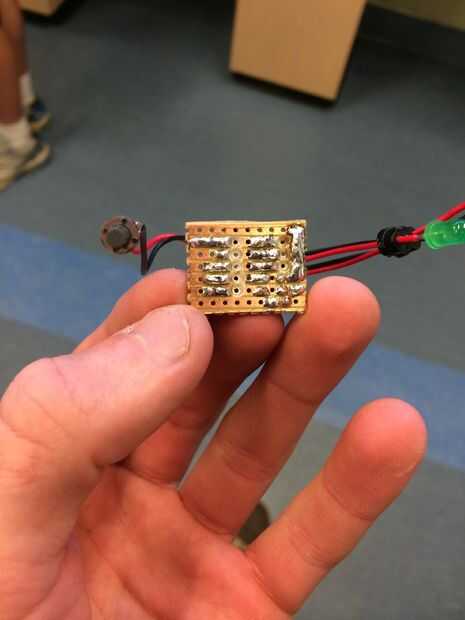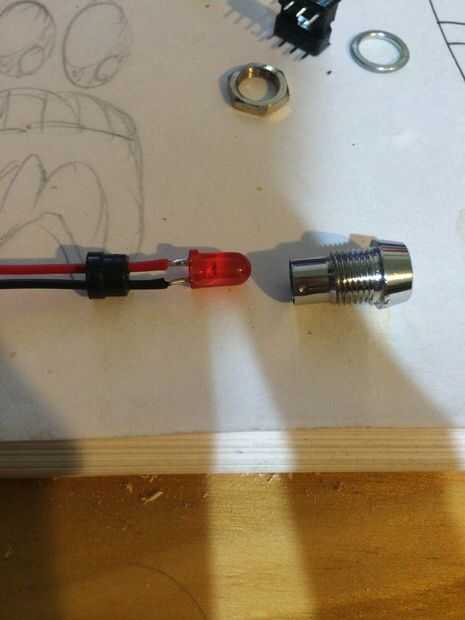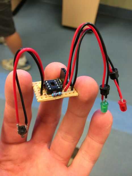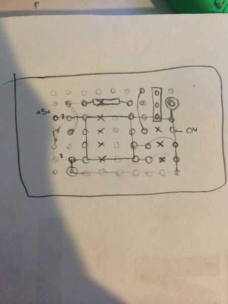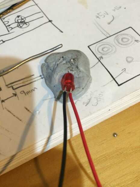 Hice el circuito que hice en un tablero de pan y dibujó tan compacta como pude en una cuadrícula de puntos incluyendo un circuito de descarga por lo que puedo cambiar el programa en el chip en cualquier momento. Esto lo hice puedo planeo cómo encajarían en un pedazo de tablero de vero, donde necesito romper pistas y pequeños cómo puedo hacer (él terminó 7 x 9). siguiente soldar los cables en ambos LEDs y el botón de colocar la parte inferior de los marcos en los cables de led y soldado a la placa de circuito.