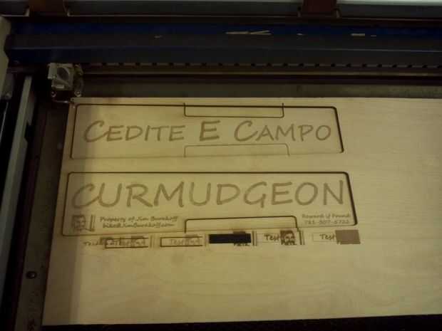 Encontré que el techshop recomienda debían ser ajustados con un poco de potencia. La madera era un poco más difícil de golpear que la madera normal... así que monté un montón de cortes de prueba en la parte inferior. Encontrar algo que lo hace a través de la primera capa de las imágenes, usted estará contento de tener la profundidad adicional más adelante cuando esté acabado y lijado.
