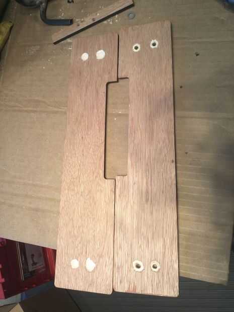 Una vez que se marca, perfore a través de cada una de las marcas con un poco del mismo diámetro que el cañón en sus t-nuts. Uso una dremel para tallar lejos un hueco poco profundo sobre cada uno de estos agujeros en la lámina superior... prueba sandwich los dos pedazos antes de colocarlos, usted quiere asegurarse de que no te estás olvidando cómo deben encajar.