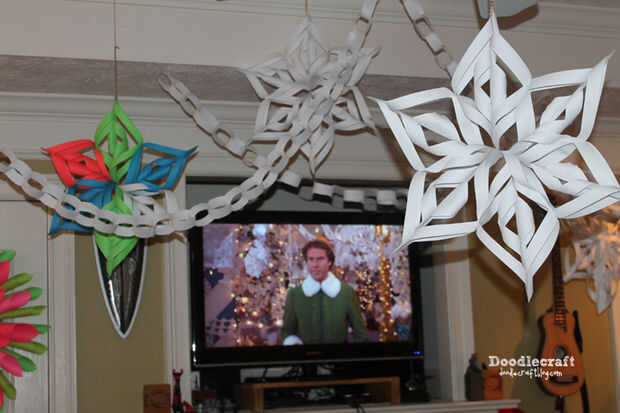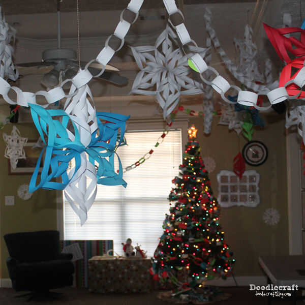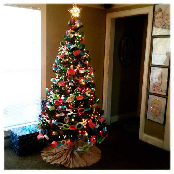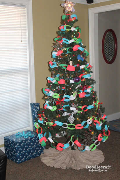 Utilizamos una cadena larga de papel para envolver alrededor de nuestro árbol de Navidad preiluminado colorido!
