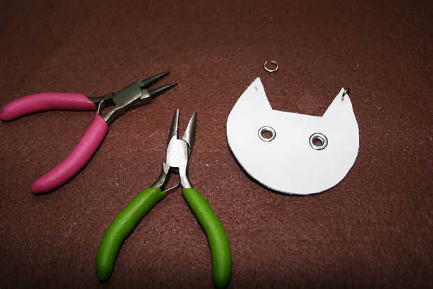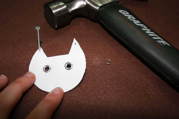 Utilizando el mismo método que antes, perfore dos agujeros en la orejas de gato en la parte superior. Tenga cuidado de no conseguir demasiado cerca del borde, como usted no desee rasgar.