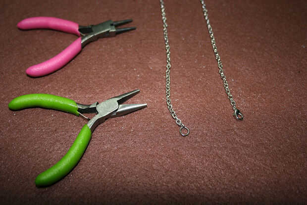 En los extremos de las cadenas, sujete los broches de joyería. Si eres diestro, puso el broche de la cadena derecha y el lazo en la izquierda. Viceversa si eres un zurdo.