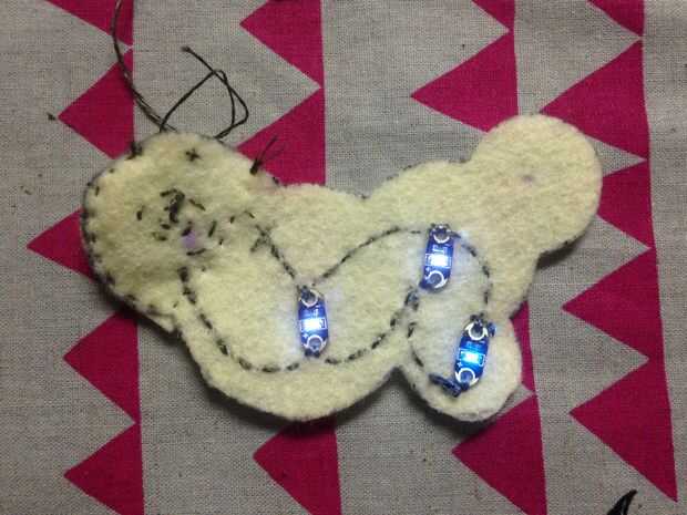 Coser a lo largo de las líneas con hilo conductor como se muestra en la imagen. Crear los puntos de contacto para los lados positivos y negativos de la batería por un patrón de espiral con el hilo conductor de la costura. Deslice la batería de botón en para probar las luces.