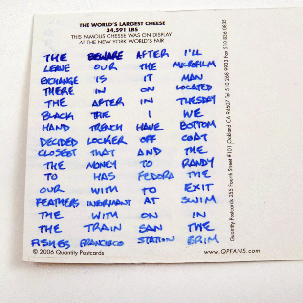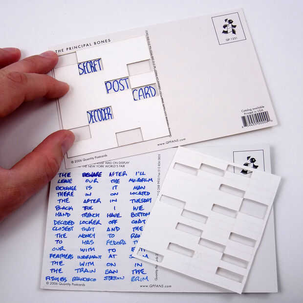 Con el mensaje codificado está listo para enviar su mensaje super secreto. Si te sientes muy inteligente puede ocultar su método de cifrado en algún lugar de tu postal. Por ejemplo, podría ocultar una lista de números que corresponden a los cortes de caja en un lugar discreto en la postal de sí mismo (cifra 1 sería: 1,4,2,4,3,2,4,2,1,3,4,4,3,1,2,3), esto permitiría que el receptor hacer su propio cifrado cortado y descifrar su mensaje. O sólo puede enviar un correo electrónico cifrado o post.