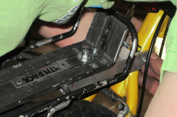 Piezas están siendo cortado y montado alrededor del marco de la bicicleta para el trailer de "enganche" tuvieron que usar una amoladora y Sierra de cinta para moldear el metal común que encajan en el marco de la pieza.