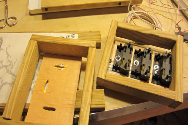 Pedazos de madera externos añadidos colocar los titulares de la batería y paneles solares en. También ha empezado el cableado para que el circuito!