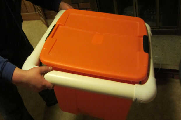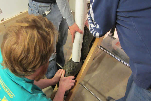 Por lo que en las dos últimas horas, hemos solucionado la lata - morder parte. Utilizando tubería de PVC para alinear correctamente las latas, los neumáticos pueden agarrar a ellas y tire de ellas para empezar a aplastar la lata.
