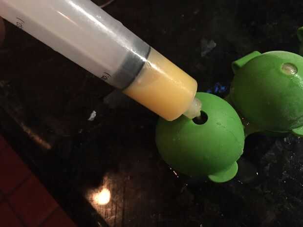 Llene una jeringa de alimentación con jugo de naranja e inyectar en el orificio superior del molde de hielo bola hasta su máximo.