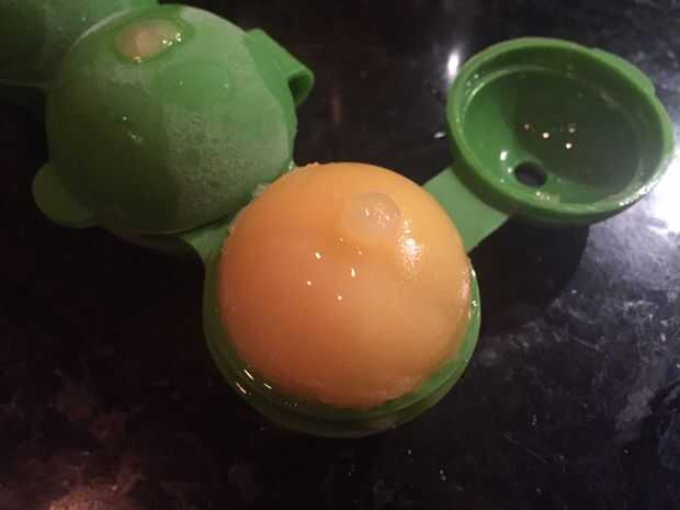 Sin tocar la esfera naranja dé vuelta el molde sobre la Copa de martini y empuje suavemente desde el fondo del molde hasta esfera jugo cae en vidrio.