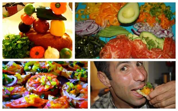Lo esencial de las personas perezosas: obtener un carb crujiente, plop algunos guac avo/tomate, luego algunos colorida salsa de cebolla/pimiento/cal, luego cubra con un trozo de pimiento asado y una ramita de cilantro. Si te gusta un poco más estimulación erótica de la comida entonces sigue leyendo...