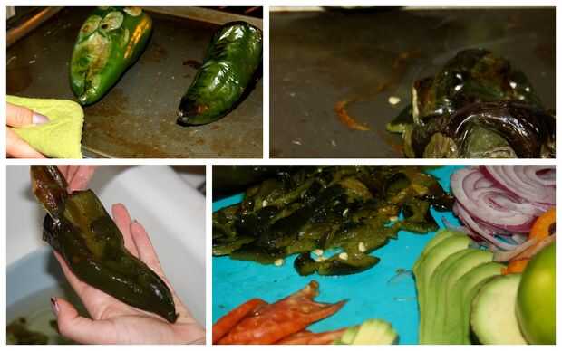 Mezclar dos (o más si pequeño rojo) chiles en el horno unos 18 minutos (flip 8) a asar hasta que en su mayoría ennegrecidas. Retirar del horno y poner en un recipiente con tapa durante 10 minutos a vapor del uno mismo (agua fría o una bolsa de papel hace el truco demasiado). La piel se pela derecha. Luego rebanada o tajada.