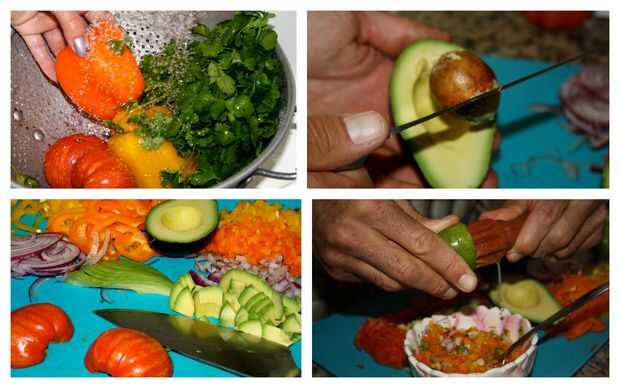 Se puede hacer durante cualquier tiempo de inactividad, una divertida fecha receta porque hay mucho que cortar y ser creativo con. Todo troceado y mezclar un poco de salsa con los pimientos anaranjados y amarillos, el chorro de 1/2 limón y 1/4 de la cebolla.